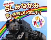 ハッピーセット「プラレール」の発売を記念して実施するキャンペーンは、親子40組80名様を対象に、SLみなかみ(D-51型蒸気機関車牽引)に乗車できる「親子で乗れる SLみなかみ 夢の体験プレゼント!」のほか、マクドナルド新橋日比谷口店(住所:東京都港区新橋2-6-7)にてプラレールの列車が走るジオラマを期間限定で展示する「マクドナルド ハッピープラレール展」の開催など、夏休み期間中に親子でお楽しみいただける内容となっています。キャンペーンの詳細は下記をご覧ください。