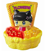 | ハンバーガー屋さんに扮した「ちゃまめっち」のおもちゃ。スイッチを入れてダイヤルを回すと、「ちゃまちゃまバーガーおまたせです!」としゃべります。 | お花屋さんに扮した「メロディっち」のおもちゃ。「メロディっち」を右に回すとオレンジに、左に回すと赤に、花が光ります。 |