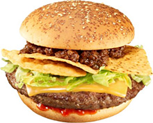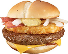 ビーフハンバーガーとアメリカの大地の恵みの出会いが生んだ「アイダホバーガー」。ハッシュポテトとビーフパティの食感のハーモニーは一度食べたら病みつきに。オニオンの薫り豊かなバンズが、ベーコン・チーズ・粒マスタードソース、コクのあるペッパーソースとともに、ポテトとビーフのコンビネーションを味わい深く彩り、大地の恵みを感じられる一品です。 -