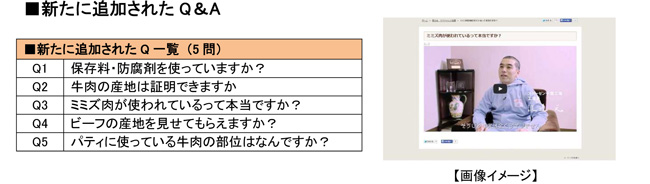 また同時に、「マクドナルド 食の安全ひろば」内のQ&Aサイト「見える、マクドナルド品質」でも、「ビーフ」に関するQ&Aを5問追加いたしました。「保存料・防腐剤を使っていますか?」「ミミズ肉が使われているって本当ですか?」などのお客様からの問い合わせに、映像、イラスト、担当者インタビューを使用し、わかりやすく回答しています。
