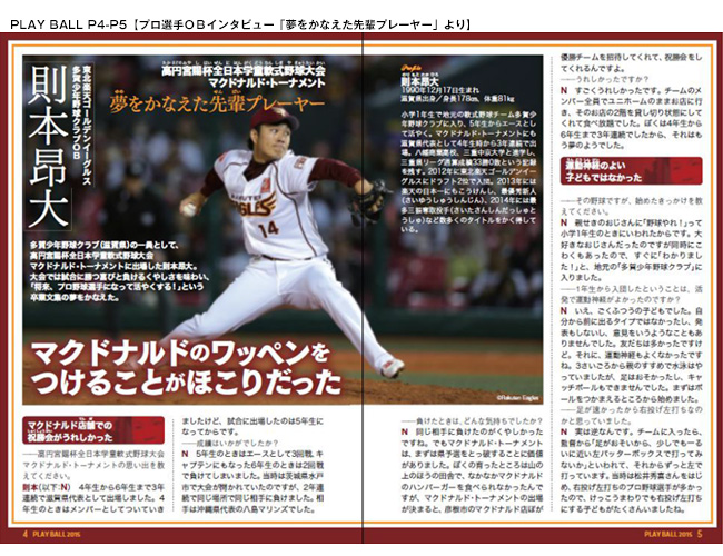 また、スポーツを楽しむ子供たちの夢を応援すべく、選手たちの日々のスキルアップや食育をサポートする“キッズスポーツ手帳”の配布を今年も継続して行い、全国の学童球児26万人に提供致します。さらに、東京ドームで開催しているマクドナルドサンデーでは全日本軟式野球連盟に所属する学童野球チームをプロ野球観戦に招待するなど、より元気に、より大きな夢を追いかけて欲しいと願い、学童球児たちをサポートしてまいります。