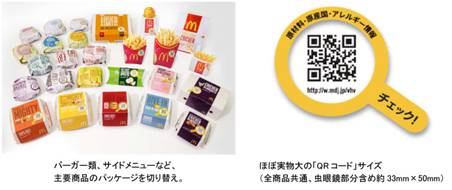 また、同調査ではマクドナルドのメニューについて、「ビーフ(パティ)はビーフ100%、つなぎも添加物も入っていないと知らなかった」(86.9%)、「卵は100%国産であると知らなかった」(96.1%)など、食材情報についての情報がお伝えできていないことから、商品情報を記載したウェブサイトの刷新、「QRコード」を大きく記載したパッケージへの変更を行います。これにより、アクセスしやすさを大幅に向上させることが出来るものと考えます。