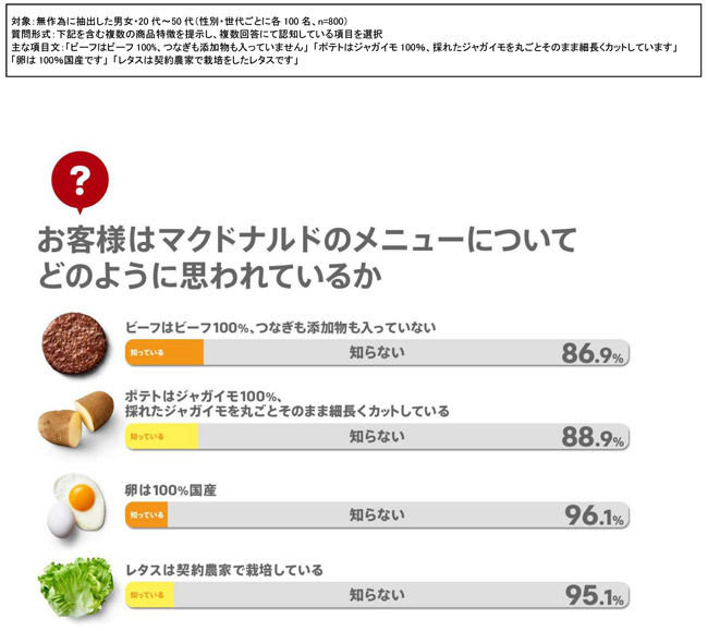 その結果、マクドナルドの情報発信はいまだ充分とはいえず、多くのお客様へ、よりアクセスしやすく、よりわかりやすい原材料情報等の提示が必要であることが明らかになりました。