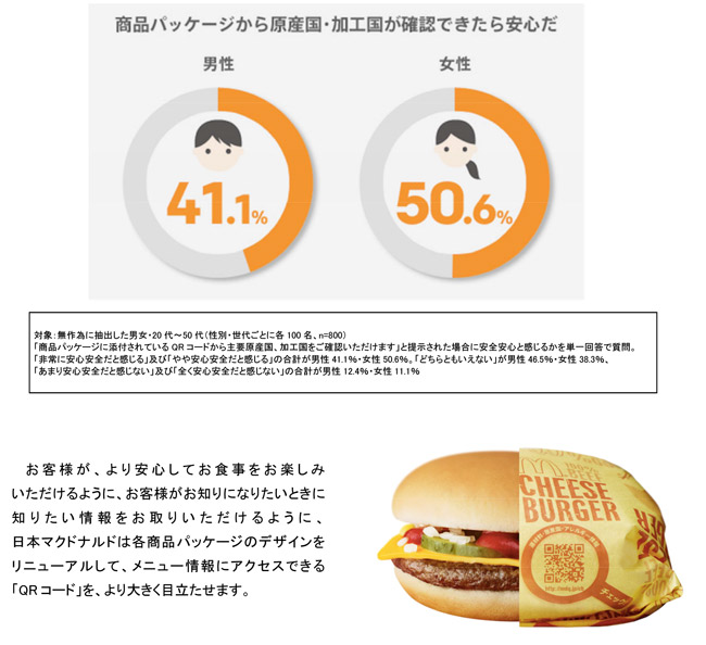 日本マクドナルドが2015年7月に実施した消費者調査では、女性50.6%の方から「商品パッケージに記載されたQRコードから主要原産国・加工国が確認できると安心」との回答がありました。