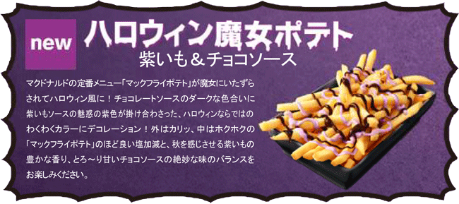 「ハロウィン魔女ポテト 紫いも&チョコソース」は、チョコレートソースのダークな色合いに紫いもソースの魅惑の紫色が掛け合わさり、ハロウィンならではの驚きやわくわくカラーにデコレーションできる、楽しい商品です。味わいにもこだわり、外はカリッ、中はホクホクの「マックフライポテト」のほど良い塩加減と、秋を感じさせる紫いもの豊かな香り、とろ〜り甘いチョコソースの絶妙な味のバランスをお楽しみいただけます。