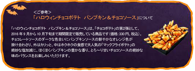 マクドナルドの「チョコポテト」は、「マックフライポテト」と「チョコレート」を組み合わせた驚きの新メニューとして、本年1月に期間限定で販売した商品です。甘くてしょっぱい新しい味わいが話題を呼び、お客さまからご好評をいただきました。また、9月から販売している「ハロウィンチョコポテト パンプキン&チョコソース」もパンプキンソースの鮮やかなオレンジ色に、チョコレートソースが掛け合わさった色合いと、ほくほくパンプキンの豊かな香りを多くのお客様に楽しんでいただいております。