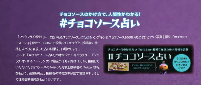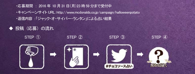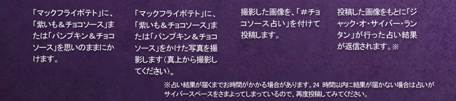 本商品は、単品でのご利用以外にも、バリューセット(Mサイズ)に60円の追加料金にて通常の「マックフライポテト」から変更が可能で、ランチや夜のお食事などさまざまなシーンでご利用いただけます。また、テイクアウトをしていただければ、ご家族、ご友人とのパーティのスナックとしてもぴったりです。ハロウィンならではの「マックフライポテト」の味わいをどうぞお楽しみください。また、「マックフライポテト」に、2色のソースを思いのままにかけた写真を撮り、「#チョコソース占い」を付けて、Twitterで投稿していただくと、投稿者の性格をズバリと表現した占い結果をお届けするキャンペーンも実施中で、既に3万5千名以上のお客様にご体験いただいております。ぜひこちらもお楽しみください。