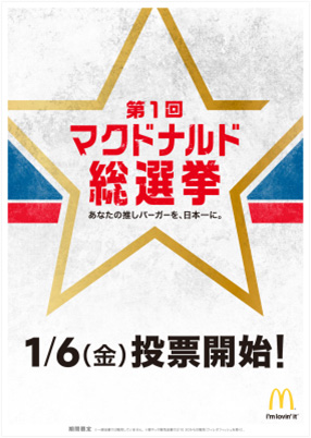 そして、来る2017年も、お客様にさらなる“おいしさ”と“楽しさ”を体験いただけるキャンペーンを展開してまいります。まずは1月6日(金)から、日本マクドナルド史上初、「商品の人気投票」でマクドナルドの日本一のバーガーを決める「第1回マクドナルド総選挙」を開始致します。
