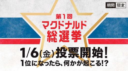 キャンペーンの詳細は本日12月26日(月)から、「第1回マクドナルド総選挙」特設サイトや公式Twitter(@McDonaldsJapan)で徐々にお知らせいたします。総選挙の全容は1月5日(木)に発表させていただく予定です。「第1回マクドナルド総選挙」にぜひご期待ください。1位のハンバーガーには何かが起こる・・(!?)