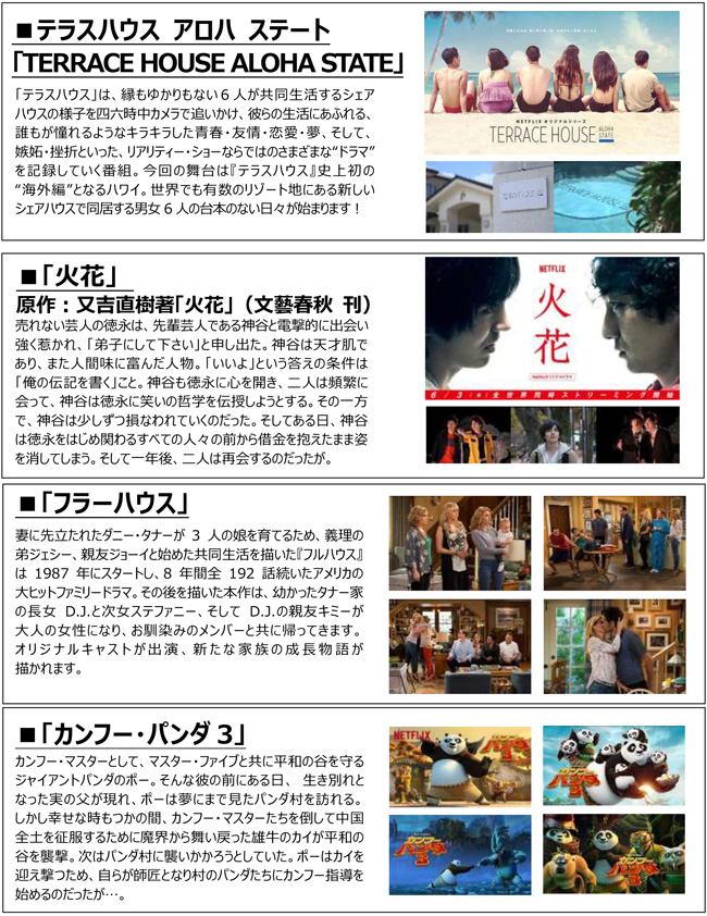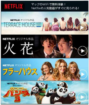 今回店舗を拡大して提供されるNetflix無料体験には、11月1日(火)よりNetflix独占配信となる話題のドラマ「テラスハウス」の最新作「テラスハウス アロハ ステート」がラインナップされます。その他も「火花」や「フラーハウス」など話題のコンテンツが体験できます。今回のサービス提供拡大を機にさらに魅力的になったラインナップを多くのお客様にご体験いただければと存じます。