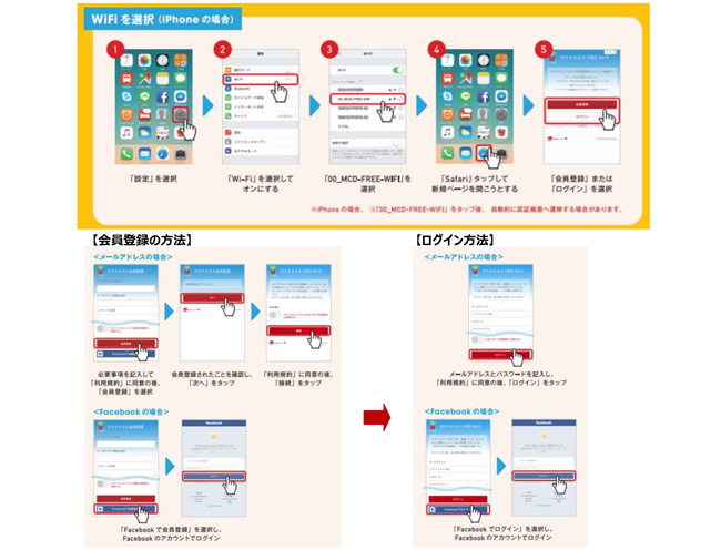 - ※ マクドナルド店舗でFREE Wi-Fiをご利用の場合、60分に一度接続をしなおす必要があります。あらかじめご了承ください。