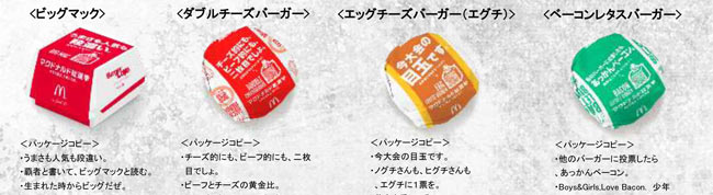 キャンペーン期間中、立候補バーガー12商品は、特別パッケージでご提供いたします。特別パッケージは48種類をご用意しております。(1商品4種類ずつ。種類によって、パッケージに記載されたコピーが異なります。)
