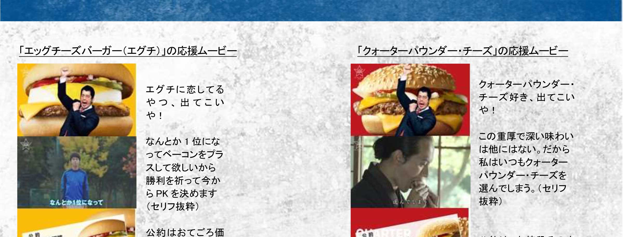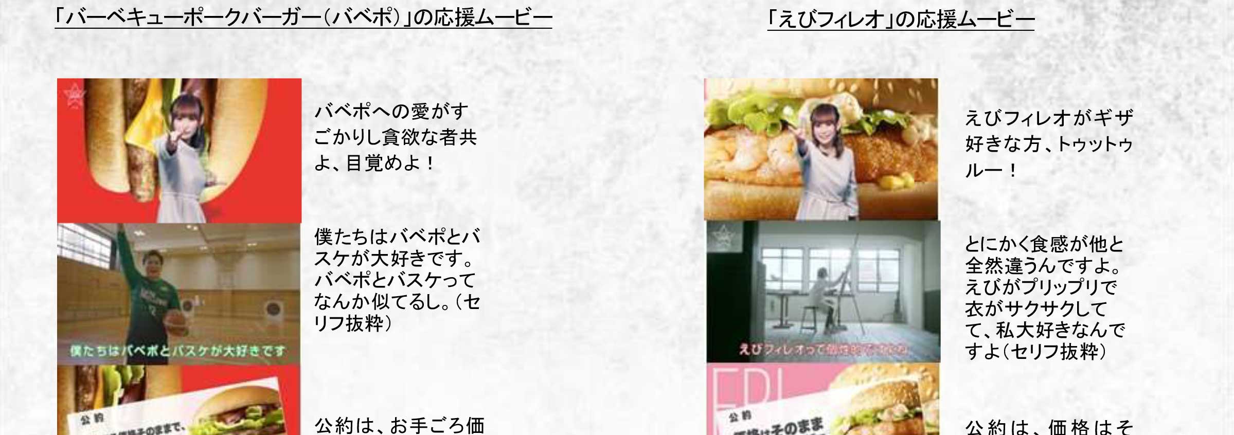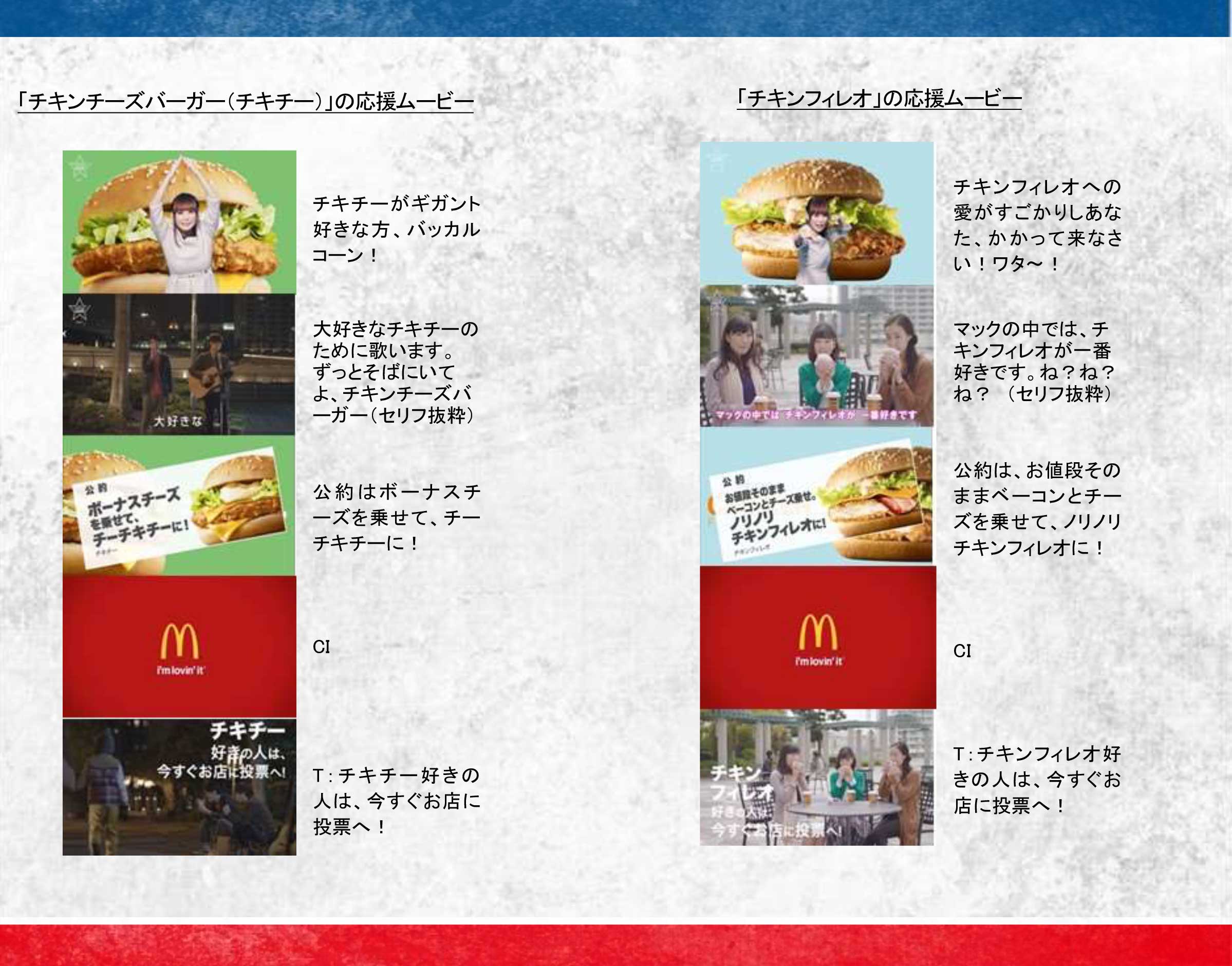 - 「第1回マクドナルド総選挙」に立候補した全12商品の公約を紹介する、12本の応援ムービー(各動画約1分)を公開します。動画の冒頭で、応援団長である田延彦さんと中川翔子さんが登場しエールを送り、続いて応援するファンの方々が商品の魅力と公約を伝えます。