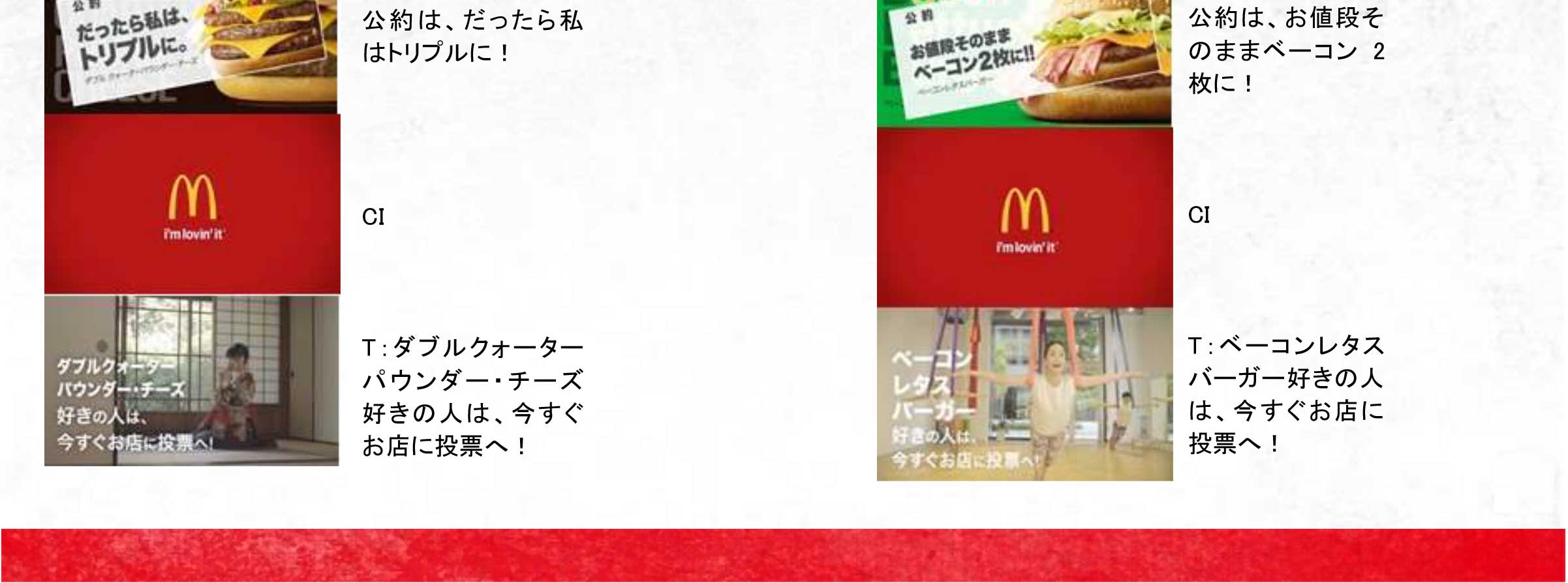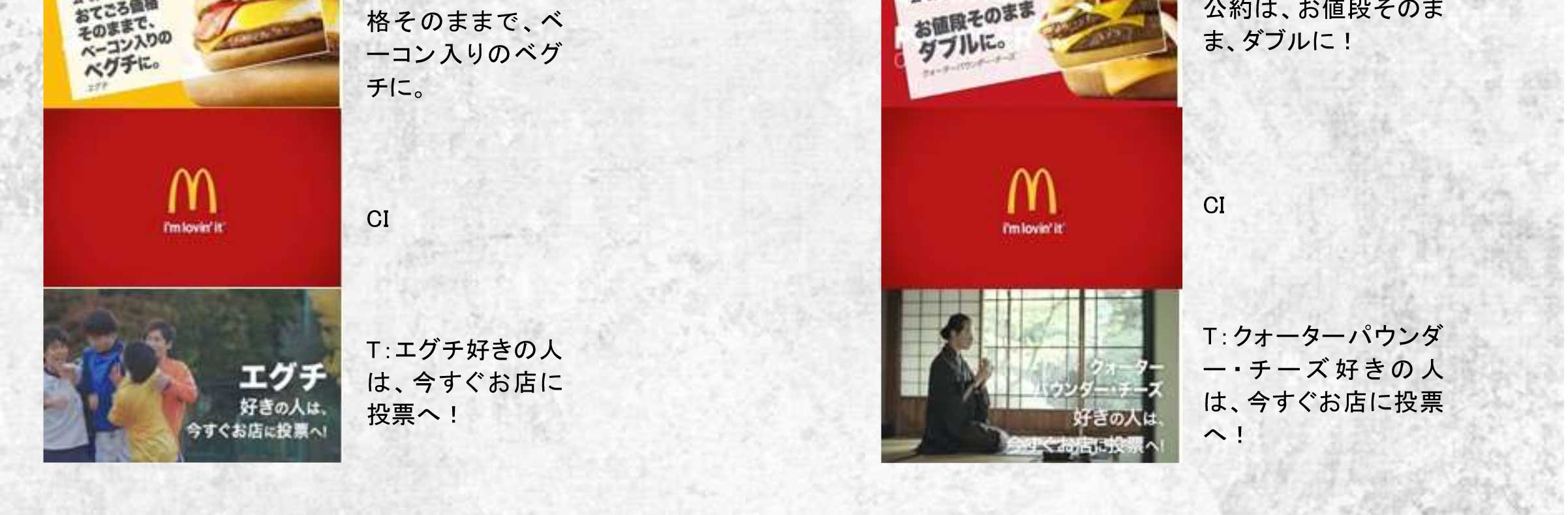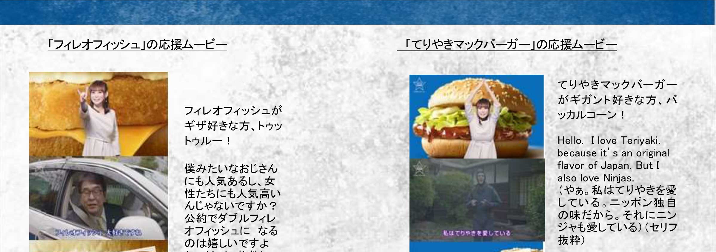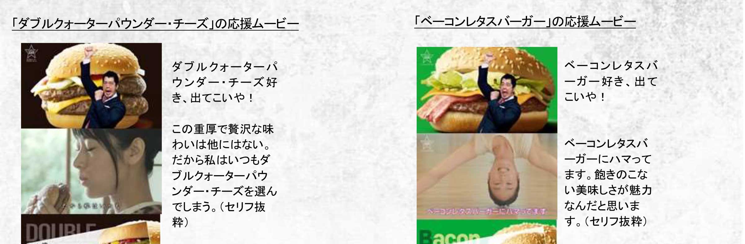 - 「第1回マクドナルド総選挙」に立候補した全12商品の公約を紹介する、12本の応援ムービー(各動画約1分)を公開します。動画の冒頭で、応援団長である田延彦さんと中川翔子さんが登場しエールを送り、続いて応援するファンの方々が商品の魅力と公約を伝えます。