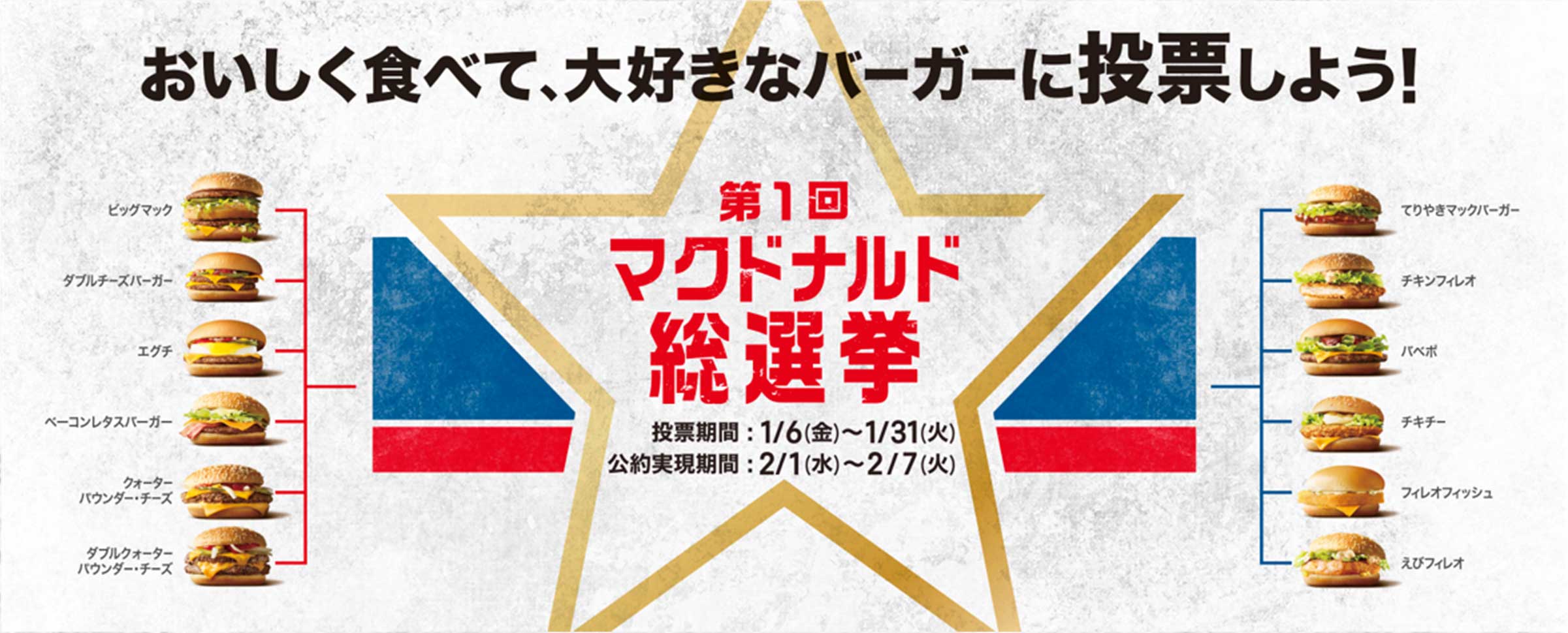 日本マクドナルド株式会社(本社:東京都新宿区、代表取締役社長兼 CEO:サラ・エル・カサノバ)は、お客様からの人気投票により、マクドナルドのレギュラーバーガー12種類からマクドナルドの日本一のバーガーを決める「第1回マクドナルド総選挙」を、1月6日(金)から全国のマクドナルドにて開始いたします。