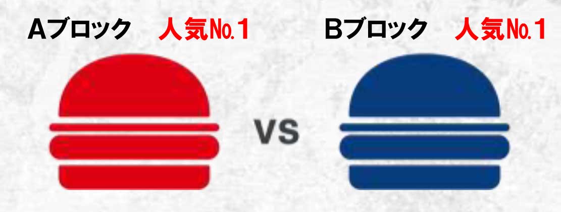 Aブロック(6種類)、Bブロック(6種類)それぞれの立候補バーガーから、決勝戦に進出するバーガーを決定します。