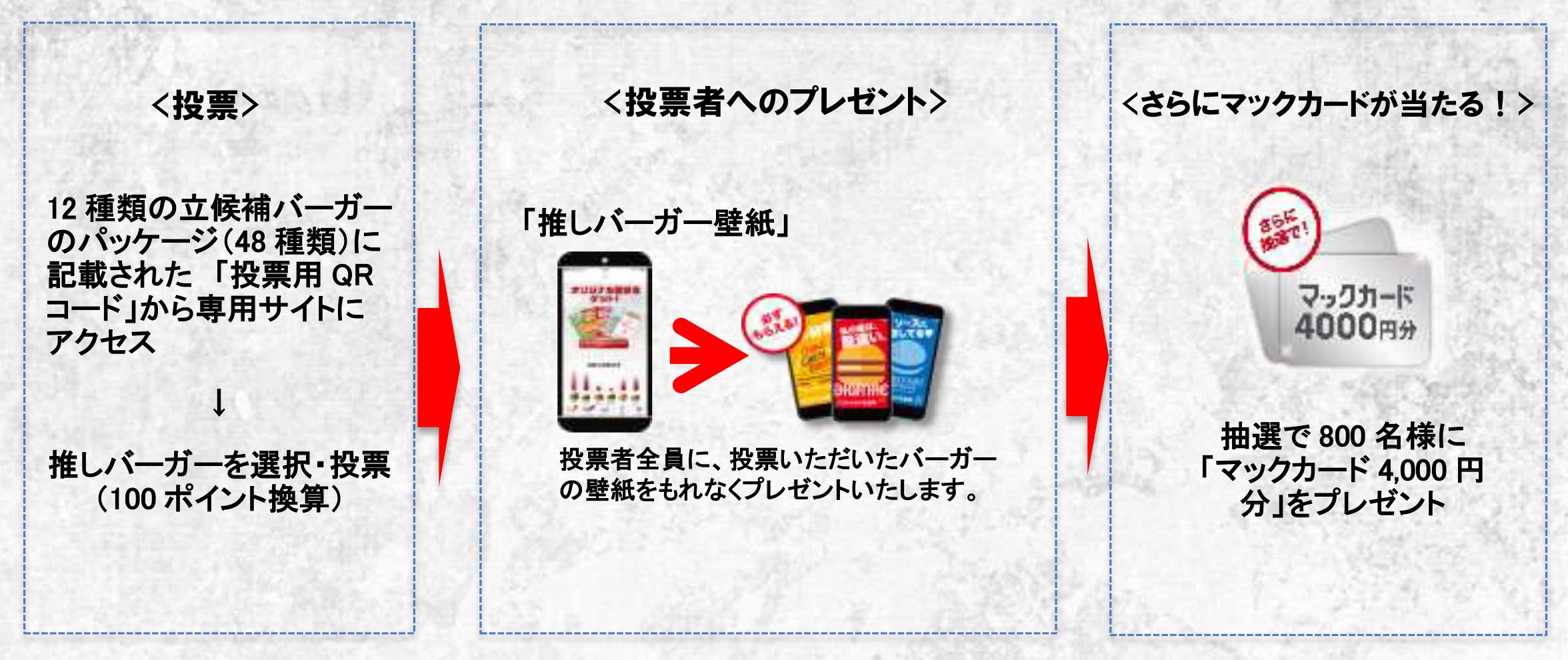 総選挙の12種類の立候補バーガーのパッケージに記載された「投票用QRコード」から、専用サイトにアクセスし、推しバーガーに投票することで、1票=100ポイント換算で投票いただけます。また、投票いただくと、スマホの待ち受け画面にできる「推しバーガー壁紙」をもれなくプレゼントいたします。さらに、投票者の中から抽選で800名様に、「マックカード4,000円分」が当たります。