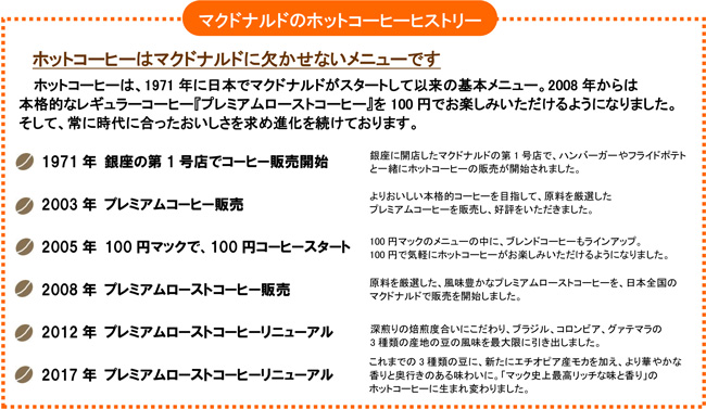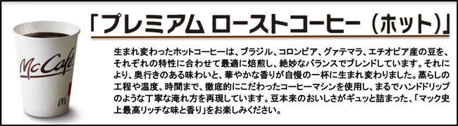 - ※生まれ変わった『プレミアムローストコーヒー(ホット)』の原材料の最終加工国、主な原料の原産地情報は、マクドナルドホームページで