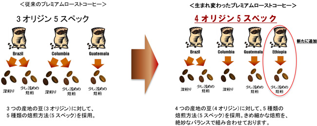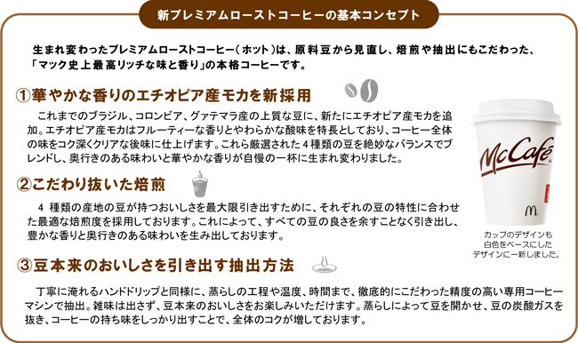 「おいしさ向上宣言」の第一弾として登場するのが、原料豆から見直して「マック史上最高リッチな味と香り」を実現した『プレミアムローストコーヒー(ホット)』です。これまで使用してきた3種のコーヒー豆に、エチオピア産モカを新たに加えて、4種類の豆をブレンドいたしました。エチオピア産モカは、フルーティーな香りとやわらかな酸味を特長としており、コーヒー全体の味をコク深くクリアな後味に仕上げています。また、焙煎方法にもこだわり、個々の豆の特性に合わせて最適に焙煎し、絶妙なバランスでブレンドしています。見た目でもコーヒーをお楽しみいただけるよう、カップも白色をベースにしたデザインに生まれ変わりました。これまでのプレミアムローストコーヒーの特長であるこだわりの抽出方法は継続し、ハンドドリップのような“蒸らし”の工程があり、抽出温度にもこだわった精度の高い専用のコーヒーマシンで抽出します。