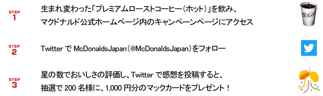 この自信作を、より多くのお客さまにお試しいただけるよう、1月16日(月)から20日(金)までの5日間の朝の時間帯(午前7時〜午前10時)は、全国のマクドナルド全店舗にて『プレミアムローストコーヒー(ホット)』Sサイズの販売をしません。その代わりに、無料でお試しいただけるキャンペーンを実施いたします。また、生まれ変わったコーヒーを星の数で評価し、Twitterで投稿いただくとマックカードが抽選で当たるツイッターキャンペーン「星いくつ?キャンペーン」を実施するほか、今回、ギャップとインパクトを表現するため、数々の名作アニメの声優を務めていらっしゃいます古谷(ふるや)徹(とおる)さんにナレーションでご出演いただきました新TV-CMも、1月16日(月)からオンエアいたします。(詳細は下記をご参照ください)