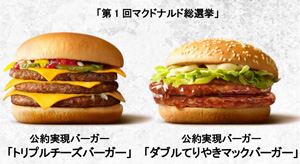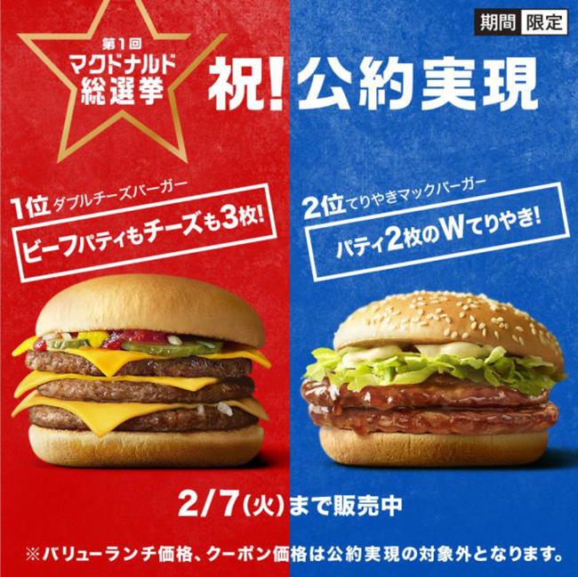 1位になった「ダブルチーズバーガー」と2位の「てりやきマックバーガー」の2商品は、投票に参加くださったお客様への感謝の気持ちをこめ、それぞれの公約を実現し、本日2月1日(水)から7日(火)まで、「トリプルチーズバーガー」を単品320円(税込)、Mセット620円で、「ダブルてりやきマックバーガー」も単品320円(税込)、Mセット620円で販売します。