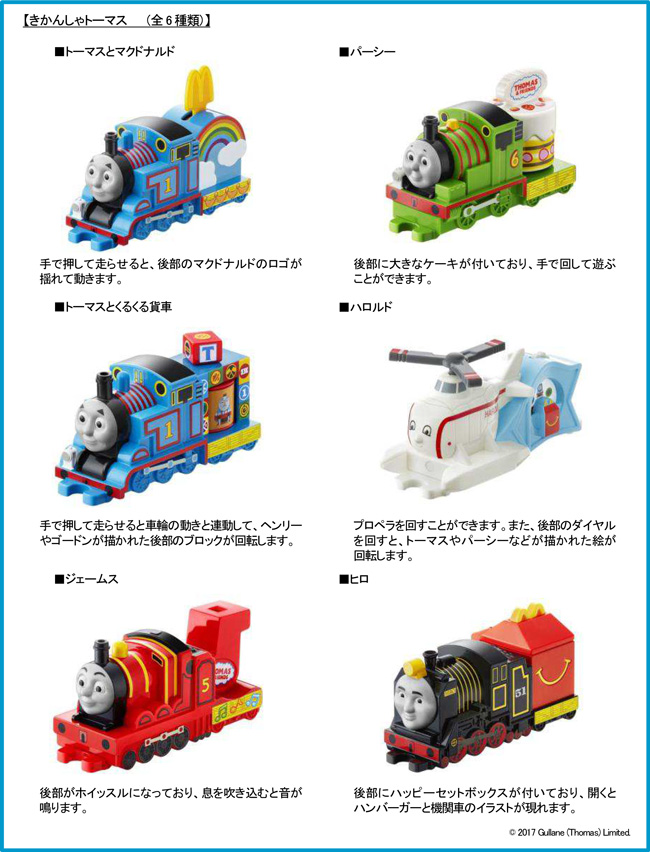 「きかんしゃトーマス」は、世界中で長年愛され、日本では4月に新作映画の公開も控える人気キャラクターです。ハッピーセットには、トーマス、パーシー、ハロルド、ジェームス、ヒロの手転がしで遊べるおもちゃが全6種登場します。手で押して走らせるとマクドナルドのロゴが動く「トーマスとマクドナルド」、ケーキが回転する「パーシー」、 プロペラを回すことができる「ハロルド」など、マクドナルド限定の楽しい仕掛けが付いています。また、すべてのおもちゃは連結できるようになっており、おもちゃ同士をつなげて遊ぶことができます。