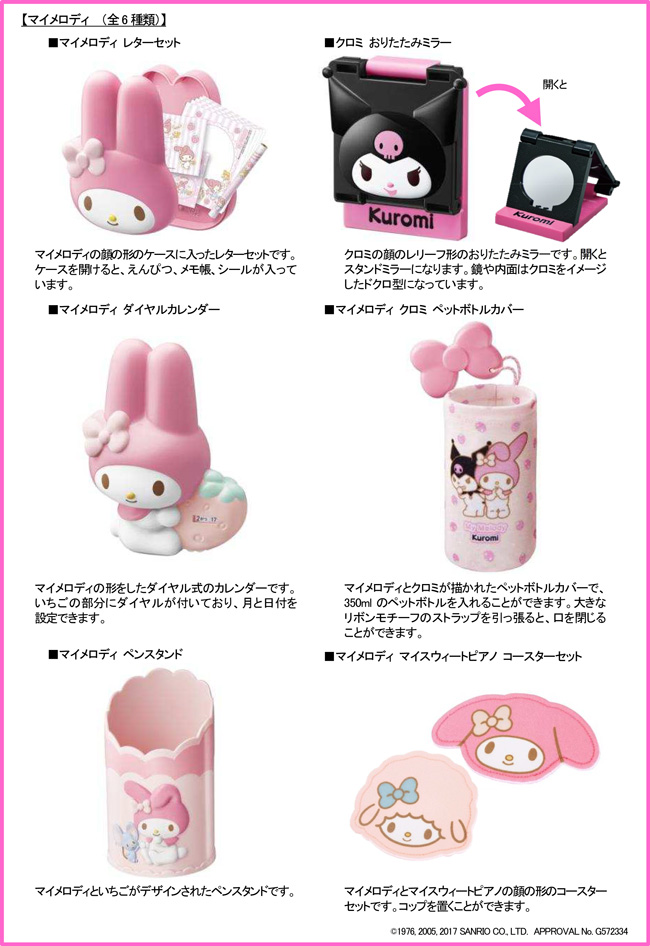 「マイメロディ」は1975年に誕生して以来、幅広い世代に人気のサンリオキャラクターです。今回のハッピーセット「マイメロディ」は、「マイメロディ」に加え、ハッピーセットに初登場となる自称ライバルの「クロミ」、お友達の「マイスウィートピアノ」をモチーフにしたかわいいおもちゃが全6種登場します。レターセットやダイヤル式のカレンダー、おりたたみ式のミラーやコースターセットなど、おもちゃはいずれも女の子の日常生活にぴったりのアイテムです。