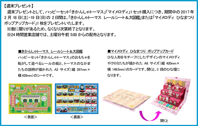 また、期間中の2月18日(土)・19日(日)の2日間は、ハッピーセット「きかんしゃトーマス」「マイメロディ」1セット購入につき、「きかんしゃトーマスレールシート&大図鑑」または「マイメロディひなまつりポップアップカード」1枚をプレゼントします。