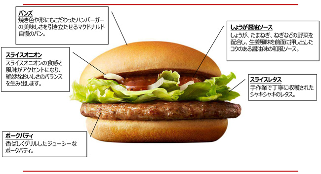2017年、マクドナルドでは、レギュラー商品のおいしさにも徹底的にこだわる「おいしさ向上宣言」を新たなテーマに掲げました。そして、第1弾として1月に発表した「プレミアムローストコーヒー(ホット)」のリニューアルに続く、「おいしさ向上宣言」の第二弾として「しょうが焼きバーガー」が、大人気の「おてごろバーガー」の新たなラインアップとして登場します。「しょうが焼き」をイメージした新商品で、生姜風味を前面に押し出したコクのある醤油味の和風ソースは、香ばしくグリルしたジューシーなポークパティと相性抜群。「しょうが焼き」の香りが食欲をそそります。さらにスライスオニオンの食感と風味がアクセントとなり、まさにしょうが焼きを食べているような絶妙な味わいに仕上げました。