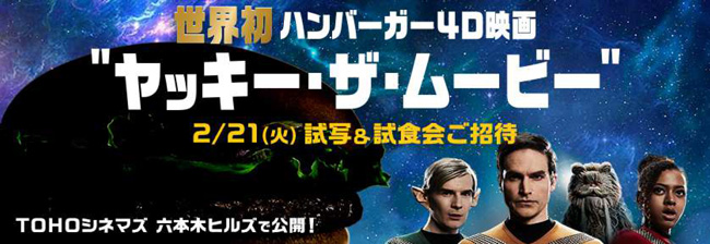 味以外のすべてが体験できるハンバーガー4D映画「ヤッキー・ザ・ムービー」の「予告篇」は2月16日(木)15時30分より、またTOHOシネマズ 六本木ヒルズ 無料試写会で上映される「本篇」は2月21日(火)19時00分より下記のURLからご覧いただけます。