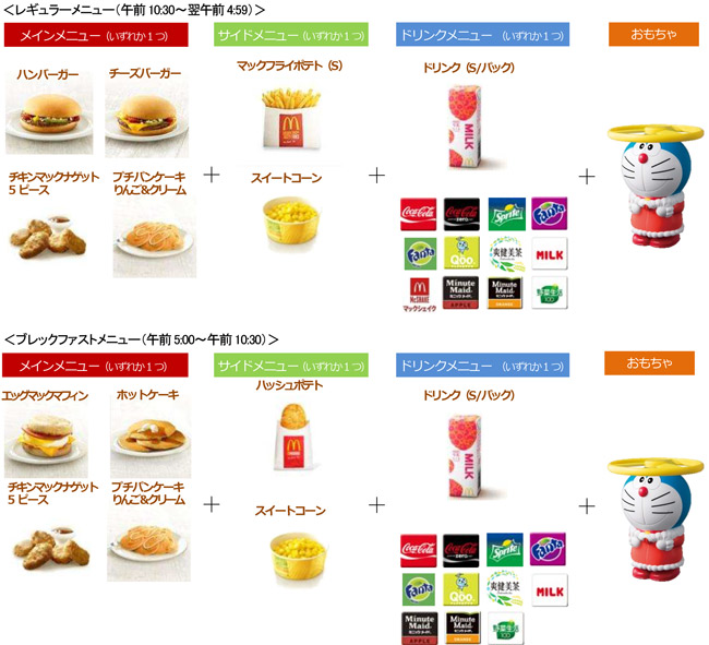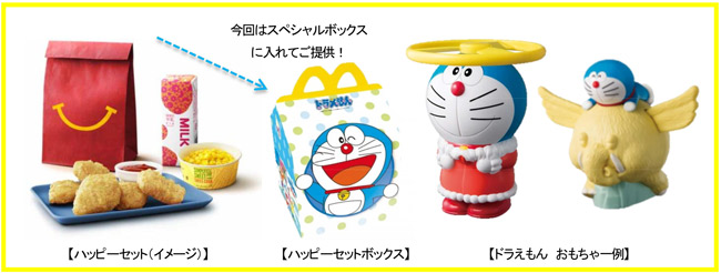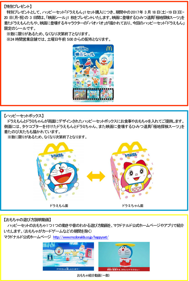 日本マクドナルド株式会社(本社:東京都新宿区、代表取締役社長兼 CEO:サラ・エル・カサノバ)は、男女問わず親子三世代に愛されている「ドラえもん」のおもちゃがセットになった、ハッピーセット「ドラえもん」を2017年3月17日(金)から期間限定で全国のマクドナルド(一部店舗除く)にて販売いたします。