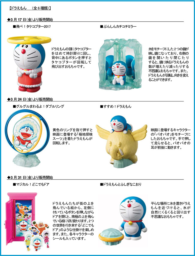 今回のハッピーセット「ドラえもん」は、3月4日(土)公開の「映画ドラえもん のび太の南極カチコチ大冒険」にちなんだおもちゃが全6種登場します。映画に登場するひみつ道具「極地探検スーツ」を着たドラえもんや、氷をモチーフにしたおもちゃ、また映画のキャラクターである「パオパオ」など、映画の世界観を楽しめるハッピーセット限定のおもちゃです。ドラえもんの頭のタケコプターが飛び出す「飛べ!タケコプター2017」や、ボタンを押してドアを開くと絵が変わる「マジカル!どこでもドア」、ドラえもんが回転する「グルグルまわるよ!ダブルリング」など、すべてのおもちゃにはお子様の好奇心を刺激するふしぎな仕掛けがついています。今回は、「ドラえもん」と「ドラミちゃん」が両面にデザインされたスペシャルボックスにお食事とともに入れてご提供します。