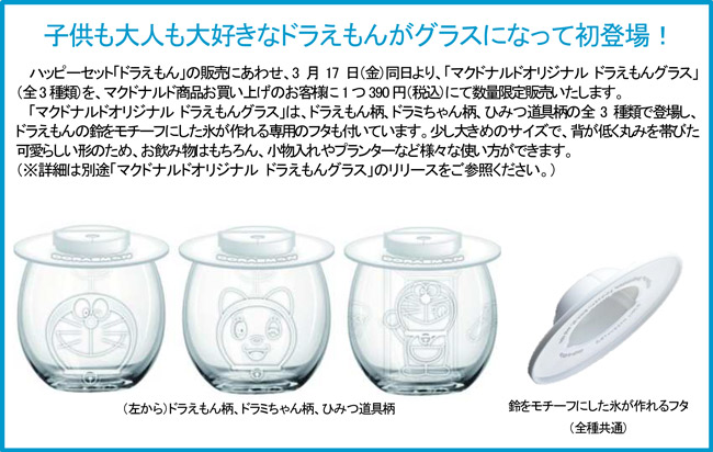 また、ハッピーセット「ドラえもん」の販売に合わせ、3月17日(金)同日より「マクドナルドオリジナル ドラえもんグラス」(全3種類)をマクドナルド商品とセットで数量限定販売いたしますので、ハッピーセットと合わせて「ドラえもん」の世界観をお楽しみいただければと存じます。