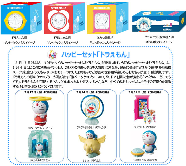 日本マクドナルド株式会社(本社:東京都新宿区、代表取締役社長兼 CEO:サラ・エル・カサノバ)は、2017年3月17日(金)より、「マクドナルドオリジナル ドラえもんグラス」(全3種類)を、マクドナルド商品をお買い上げのお客様に、1つ390円(税込)にて数量限定販売いたします。さらに、全3種が揃った「グラスセット」も1100円(税込)で販売いたします。
