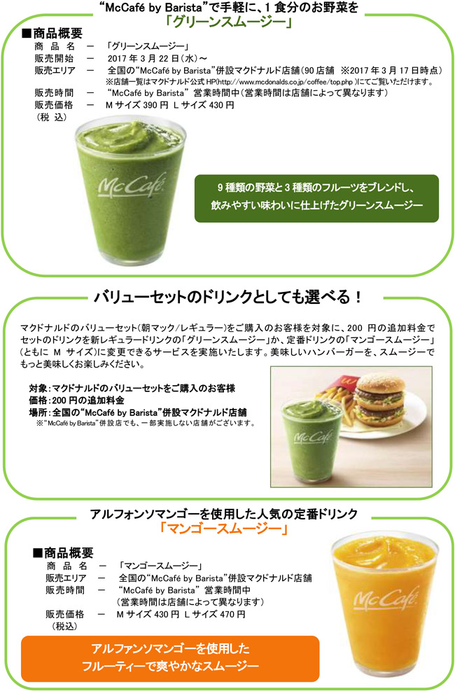 また3月22日(水)から“McCafé by Barista”併設店舗では、マクドナルドのバリューセット(朝マック/レギュラー)のドリンクを200円の追加料金でグリーンスムージーかマンゴースムージー(ともにMサイズ)に変更できるサービスを実施いたします。美味しいハンバーガーを、スムージーでもっと美味しくお楽しみください。