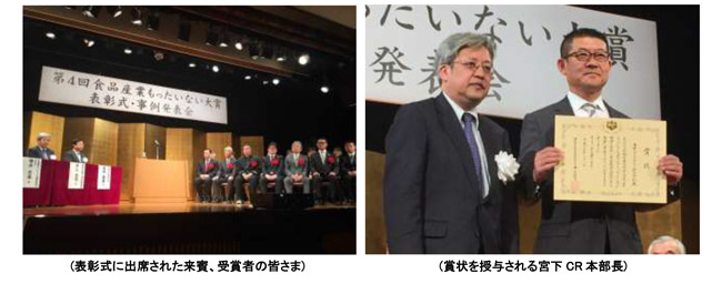 「食品産業もったいない大賞」は、農林水産省協賛の表彰制度で、食品産業の持続可能な発展に向け、地球温暖化・省エネルギー対策の一環でもある「エネルギー・CO2削減」、「廃棄物量削減・再生利用」、「教育・普及(消費者に最も身近な食品を通してこれらの啓発を促す)」等の観点から、顕著な実績を挙げている食品関連事業者並びに食品産業によるこうした取組みを促進・支援している企業、団体及び個人が表彰されるものです。